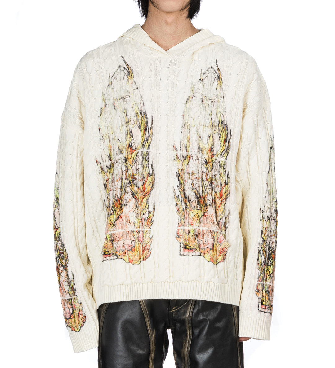 WHO DECIDES WAR FLAME GLASS CABLE KNIT HOODED PULLOVER CREAM