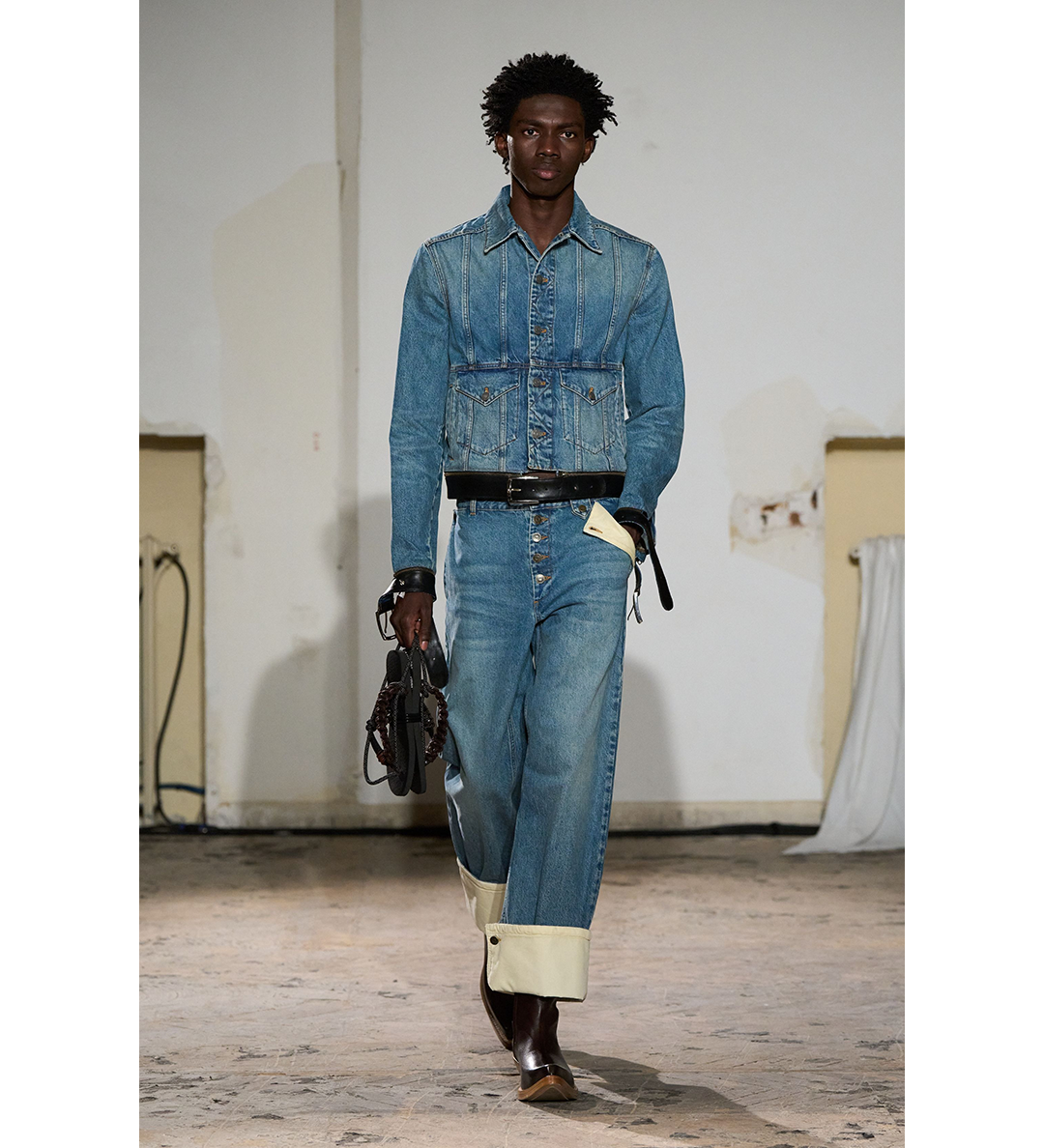 LEATHER STRAP DENIM JACKET SEMI WASHED DENIM