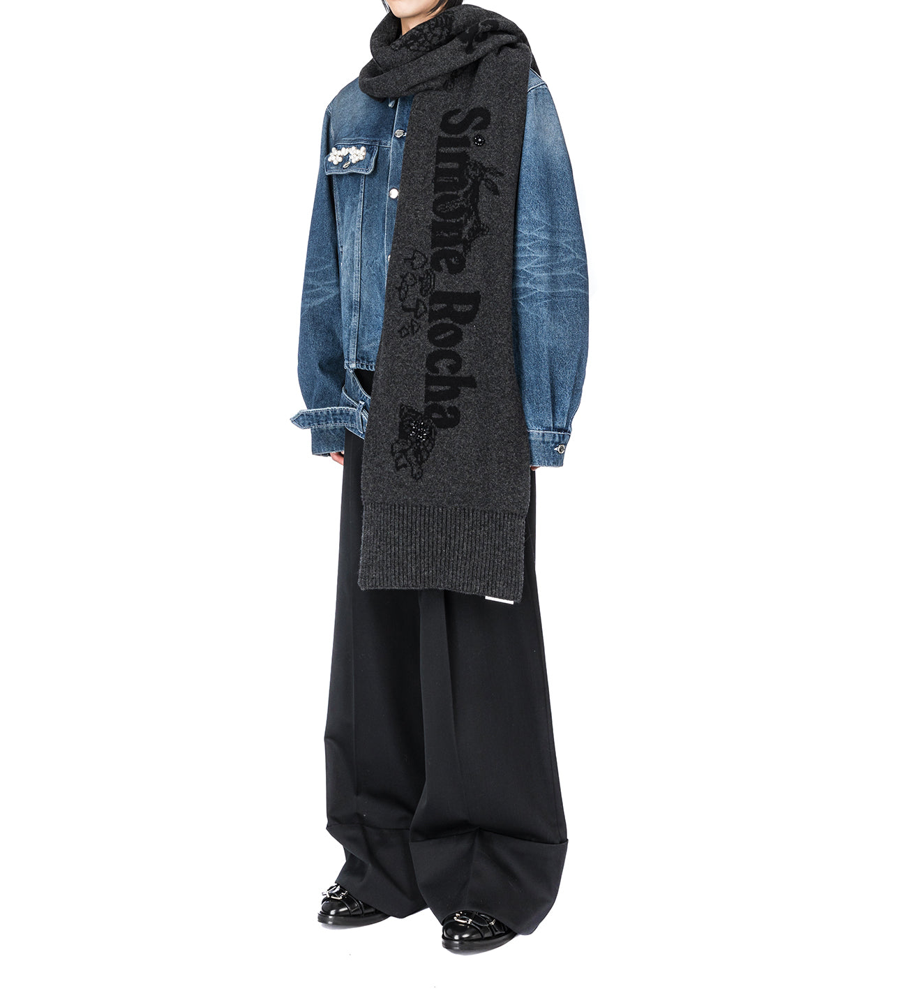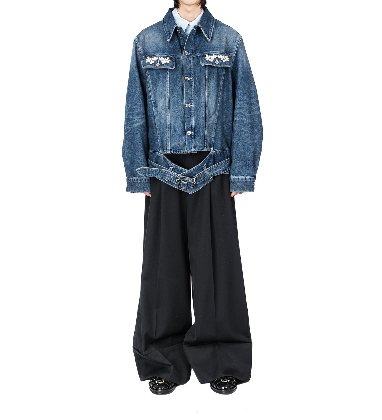 SIMONE ROCHA MULTI BELT WAIST TAIL DENIM TRUCKER JACKET DISTRESSED BLUE/PEARL