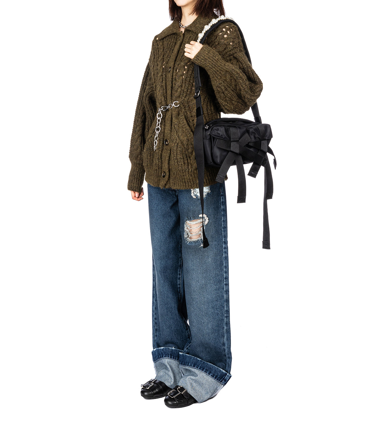 SIMONE ROCHA SCULPTED COLLARD CHUNKY KNIT CARDIGAN W/CHAIN OLIVE