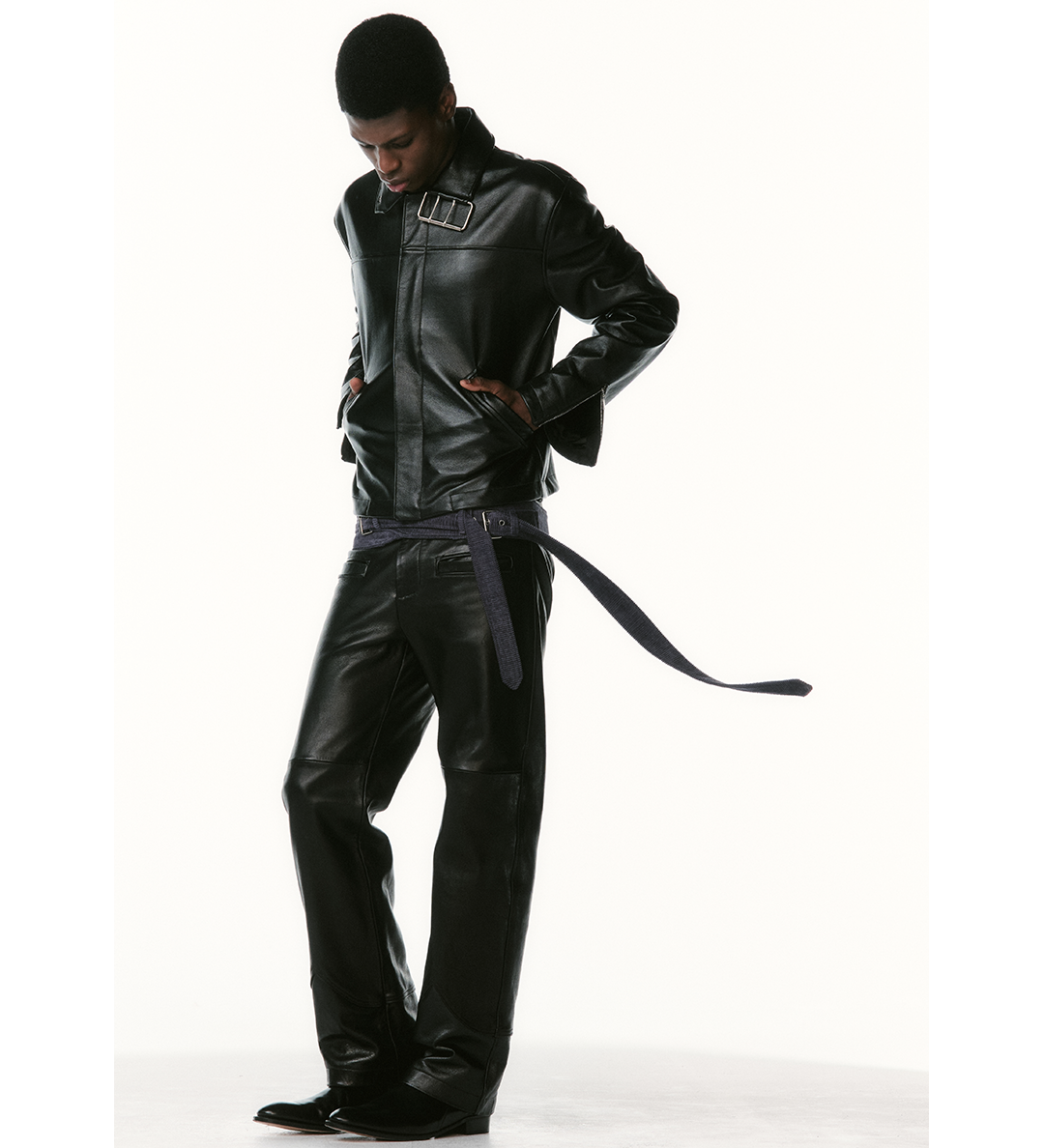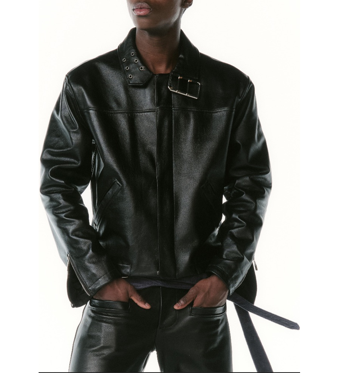 COLLAR BELT LEATHER JACKET BLACK
